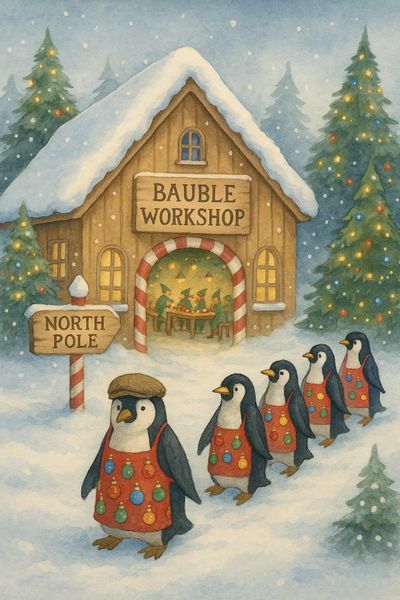 By day, the penguins queue up in their bauble-printed aprons to polish ornaments to a mirror gleam. By night, the owls perch in the rafters, keeping watch and recording each bauble’s tale in the great Book of Bauble Magic.
