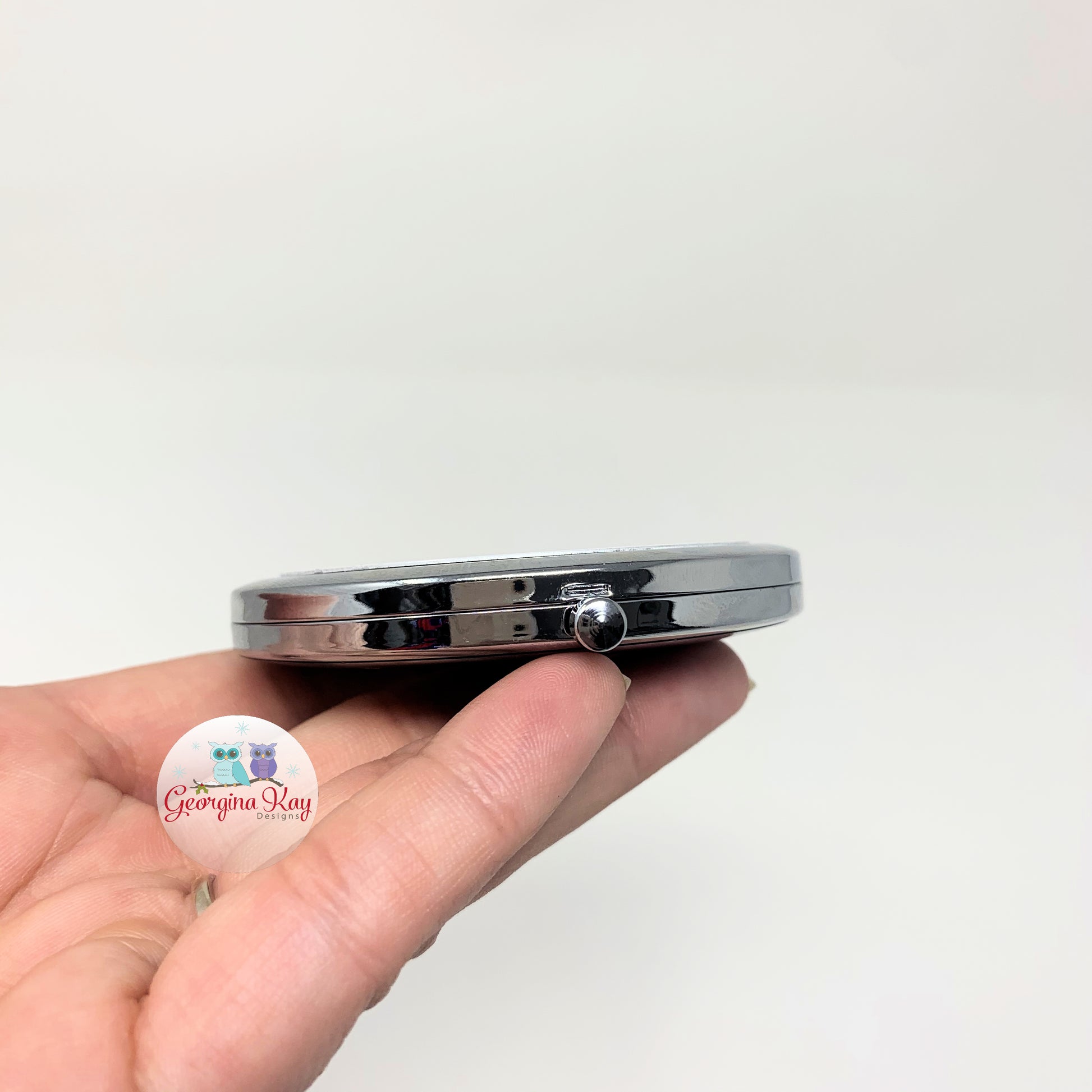 Finished in a sleek silver tone, the compact opens to reveal two mirrors, making it perfect for quick touch-ups on the go. Small enough to slip into a handbag, makeup bag, or pocket, it’s both practical and sentimental.